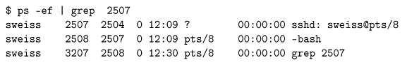 The UID column is the user login name. The PID column is the process id of the process. The PPID column is the parent process’s process id. The C field is rarely of interest; it gives processor utilization information. The STIME field is the starting time in hours, minutes, and seconds. The TIME column is the cumulative execution time, which for short commands will be zero, since the smallest unit of measurement in this column is seconds. The CMD column is the command line being executed by this process; in this case there are two: bash and “ps -f”. All command line arguments are displayed; if any are suppressed, the command will appear in square brackets: