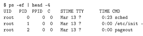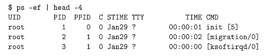 $ ps -ef | head -4 UID PID PPID C STIME TTY TIME CMD root 1 0 0 Jan29 ? 00:00:01 init [5] root 2 1 0 Jan29 ? 00:00:02 [migration/0] root 3 1 0 Jan29 ? 00:00:00 [ksoftirqd/0