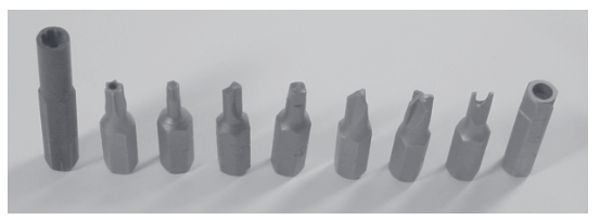 Figure 1-1: A selection of security bits. From left to right: Nintendo 4.5mm, security torx, standard torx, clutch, Robertson or square, tri-wing, torq, spanner, and security allen or hex.