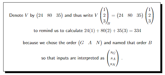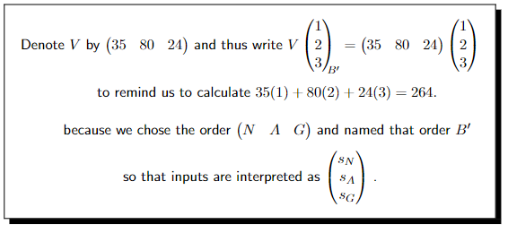 The subscripts B and B′ on the columns of numbers are just symbols2 reminding us of how to interpret the column of numbers. But the distinction is critical; as shown above V assigns completely different numbers to the same columns of numbers with different subscripts.
