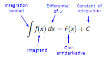 The function we want to find an an derivative of is called the integrand. It contains the differential of the variable we are integrating with respect to. The ∫ symbol and the differential dx are not “bookends” with a function sandwiched in between; rather, the symbol ∫ means “find all an derivatives of what follows,” and the function f(x) and dx are multiplied together; the dx does not “just sit there.”