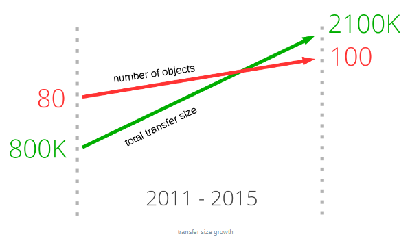 As the graph below shows, the trend has been going on for a while, and there is little to no indication that it will change anytime soon. It shows the growth of the total transfer size (in green) and the total number of requests used on average (in red) to serve the most popular web sites in the world, and how they have changed over the last four years.