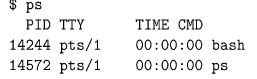 The ps command is used for viewing one or more processes currently known to the operating system. I say “currently known” as opposed to “active” because the list may include processes that are technically not active, so called zombie processes. The set of options available for the ps command is very system dependent. There were different versions of it in BSD systems and in Version 7, and then there are options added by GNU. RedHat Linux systems support all of the historical options, and so there are many different ways to use this command in Linux. In Linux, users also have the option of running the top command. The top command is very much like ps, except that it displays the dynamic, real-time view of the state of the system. It is like the Windows task manager, and also like a terminal-based version of the Gnome System Monitor. Here we will describe the standard syntax rather than the BSD style or GNU syntax. The ps command without options displays the list of processes of the login id that executes it, in a short form: