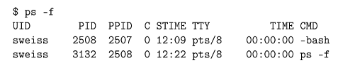 The UID column is the user login name. The PID column is the process id of the process. The PPID column is the parent process’s process id. The C field is rarely of interest; it gives processor utilization information. The STIME field is the starting time in hours, minutes, and seconds. The TIME column is the cumulative execution time, which for short commands will be zero, since the smallest unit of measurement in this column is seconds. The CMD column is the command line being executed by this process; in this case there are two: bash and “ps -f”. All command line arguments are displayed; if any are suppressed, the command will appear in square brackets: