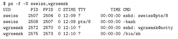 The -u and -U options are useful for viewing all of your processes or those of others in a supplied user list. The list of users must be comma-separated, with no intervening spaces. For example: