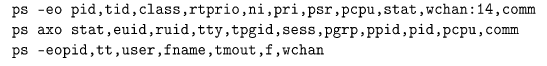 While there are dozens of other options, I will only mention one more: the -o option. You can customize the output of the ps command to include any of the dozens of attributes available to be displayed using -o. The man page gives the general format for this. Some examples from the man page: